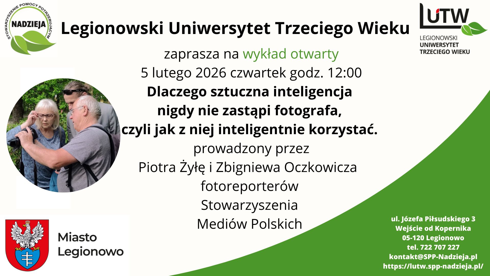 Legionowski Uniwersytet Trzeciego Wieku zaprasza na wykład otwarty 5 lutego 2026 czwartek godz. 12:00 Dlaczego sztuczna inteligencja nigdy nie zastąpi fotografa, czyli jak z niej inteligentnie korzystać. Wykład prowadzony będzie przez Piotra Żyłę i Zbigniewa Oczkowicza fotoreporterów Stowarzyszenia Mediów Polskich